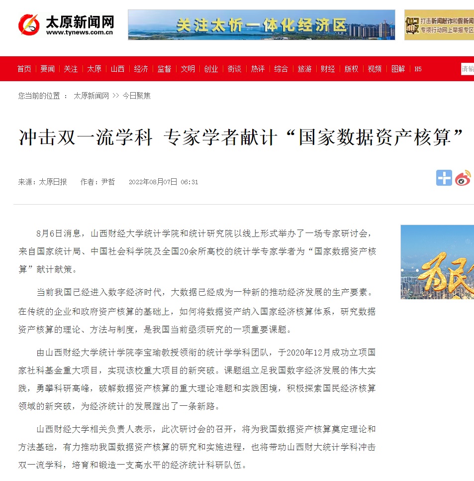 近日,《太原新闻网》以《冲击双一流学科 专家学者献计“国家数据资产核算”》为题,报道了我校国家社科基金重大项目“国家数据资产核算研究”专家讨论会情况,党委常委、副校长米子川教授参加会议并致词。原文如下: