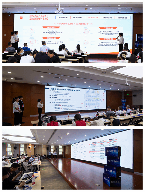 6月17日上午,8支研究生队伍围绕金价预测、心血管疾病风险、新质生产力、老年人抑郁症状的失眠、冠心病、血糖预测、中老年人群抑郁风险、山西省碳排放量等选题进行了精彩展示和答辩。参赛选手们精心准备,用创意和实力展示了各自的研究成果和专业技能,赢得了现场观众和评委的一致好评。答辩环节中,评委老师从数据来源、变量和模型选取、内容与题目的对应关系、实际应用等方面进行提问并提出针对性建议。大赛评委、山西省统计局核算处副处长童超博士对上午的比赛进行点评,强调要关注指标体系和研究主题的匹配性、文字表述的规范性、指标选用的代表性等问题,建议选手们在未来的研究中要更加深入地了解研究主题,选择合适的指标体系,以确保研究结果的准确性和可靠性。